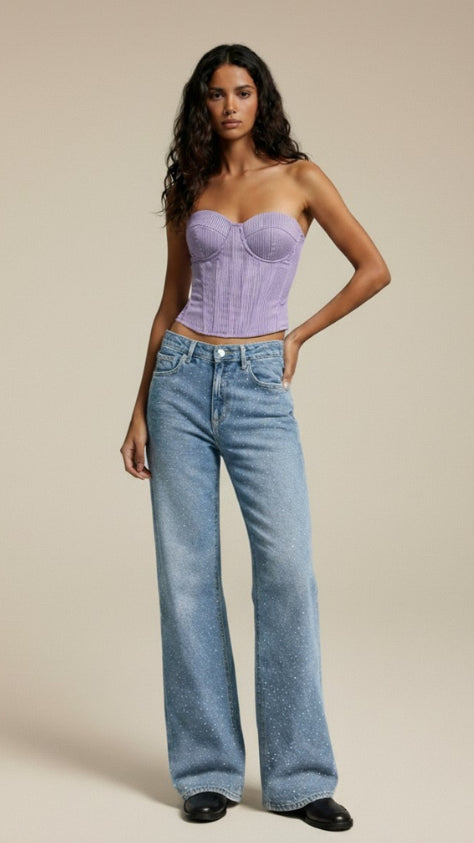 Top tejido tipo halter disponible en cuatro tonos sofisticados: negro elegante, beige neutro, marfil delicado y moka profundo. Con acabado acanalado y finas líneas de pedrería plateada en forma vertical, este diseño aporta brillo sutil...